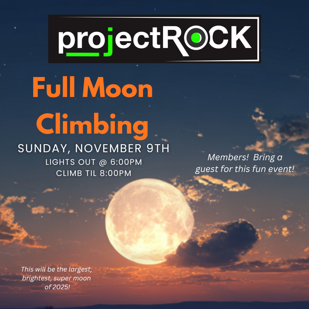 This month’s FULL MOON CLIMB will be held on November 9th. For all of you who have never been, come give it a try as we turn off the lights and climb in the dark! We turn the lights out for climbing at 6:00PM and the climbing continues until 8:00PM! Bring those headlamps or pick one up in the ProShop. Remember members get a discount on all ProShop items!