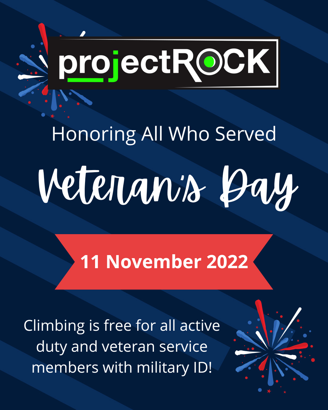 Veterans Day – November 11th – We truly thank all veterans for their service! Although we offer discounts to veterans and active military all year round, on November 11th, we would like to invite all active military and veterans to come climb for free (with proof of service). Again, THANK YOU.